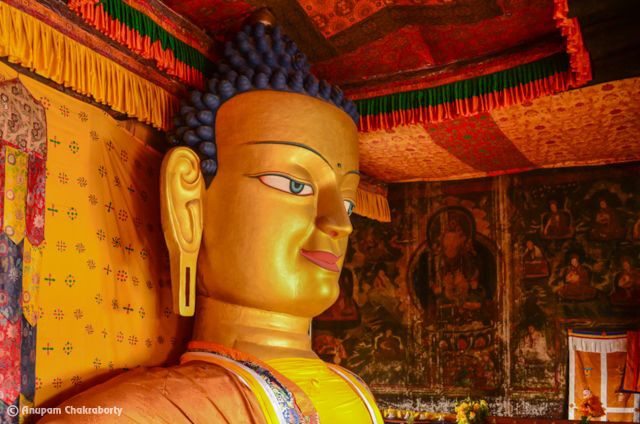 Tucked into a side valley, Likir Monastery is one of the most important Gelugpa gompas in Ladakh with the one in Thiksey. Although studies estimate that its foundations date from the eleventh century, no trace remains of this time and the monastery was probably erected during the fifteenth century, the golden age for the Gelugpa order in Ladakh. Led by the younger brother of the Dalai Lama, the monastery is home to about 120 monks and a school for young monks. A gigantic 22-metre-high golden statue of Maitreya Buddha located beside the main temple was completed in 1999.